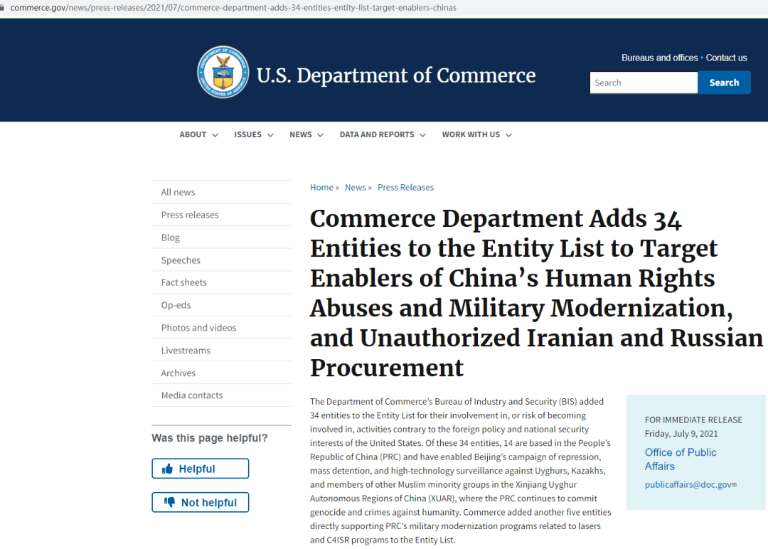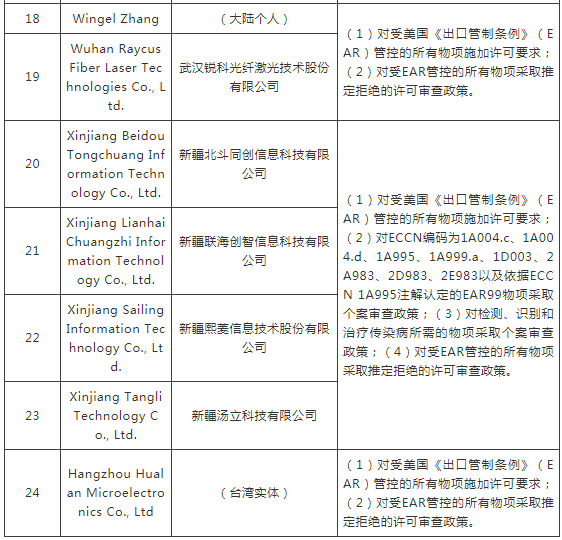 就在這個月的7月12日,美國商務部產(chǎn)業(yè)與安全局(BIS)通過《聯(lián)邦政府公報》(Federal Register)發(fā)布了一項最終規(guī)則(final rule),來自中國的24個實體/個人從事或促成了有違美國國家安全或外交政策利益的活動,因而將其列入“實體清單”。被列入清單的理由、列入后的許可要求和許可審查政策如下。