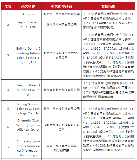 ERC認定以下實體獲取并嘗試獲取美國原產(chǎn)物項以支持人民解放軍的軍事現(xiàn)代化,有違美國國家安全和外交政策利益。