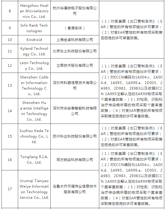 ERC認定以下實體與所謂“中國在新疆的侵犯人權行動”有牽連,違反美國外交政策,將其列入“實體清單”。