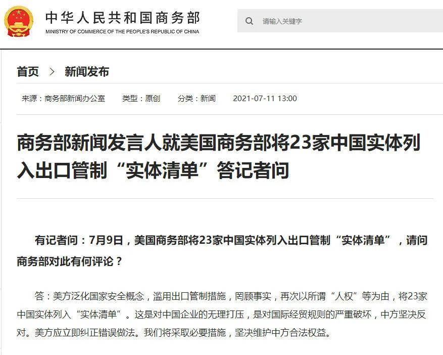 7月9日,商務部新聞發(fā)言人就美國商務部將23家中國實體列入出口管制“實體清單”答記者問:美方泛化國家安全概念,濫用出口管制措施,罔顧事實,再次以所謂“人權”等為由,將23家中國實體列入“實體清單”。這是對中國企業(yè)的無理打壓,是對國際經(jīng)貿(mào)規(guī)則的嚴重破壞,中方堅決反對。美方應立即糾正錯誤做法。我們將采取必要措施,堅決維護中方合法權益。