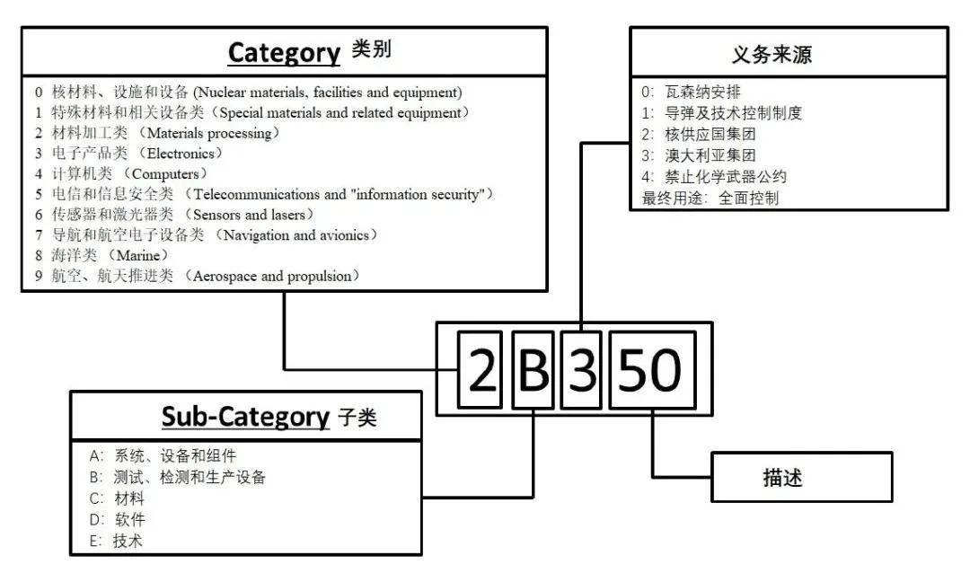 歐盟出口管制物項ECCN的第一、第二位數(shù)字排序與美國ECCN一致,都延續(xù)了《瓦森納協(xié)定》的規(guī)定。第一位數(shù)字為物項的分類,分為0~9類物項;第二列數(shù)字為物項的種類:A代表“系統(tǒng)、設備和部件”,B代表“測試、檢查和生產(chǎn)設備”,C代表“材料”,D代表“軟件”,E代表“技術”。后三位是對產(chǎn)品的描述,其中歐盟ECCN第三位數(shù)字指明該物項出口管制的義務來源,說明是出自何種國際共識。
